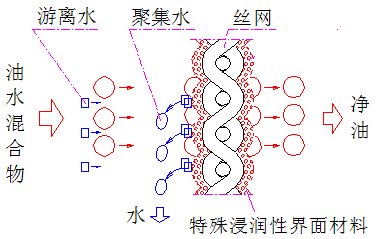 具有油水分離功能的納米界面網膜的分離原理圖:當非乳化的油水混合液流向經過修飾的微納米界面結構時,油體鋪展在全部親油涂層表面,油分子迅速浸潤并充分存在于表面結構的凹凸部分,宏觀上看含油的涂層表面相當于封有一層油滲透膜,該膜能使油分子相互置換并隨著油體的滲透朝著流動勢能的方向運動得以連續通過網膜;而油液中所含的水分在接近網膜的臨界面時,被固體表面的超疏水納米結構所疏斥,只能被拒留在油體薄膜及疏水基團物質的復合表面,與其它游離水聚結,靠重力場下油水密度差的效應匯集沉落。