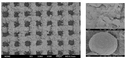 網膜表面的掃描電鏡照片:經過特殊處理,在網膜表面形成的微米/納米結合結構幫助網膜形成了超親油/超疏水的表面特性。
