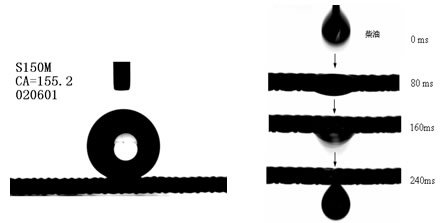 水在本功能納米界面網膜表面的接觸角為155±1.2°,滾動角為3°,所以具有超強的疏水性能。油滴在本功能納米界面網膜表面的接觸角為0°±1.3°,因此柴油在網膜表面很容易鋪展及滲透,大約在240ms時即可完全透過網膜,所以具有超強滲透油品的能力。
